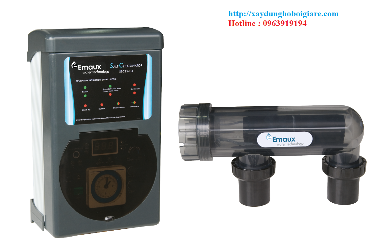 Máy Điện Phân Muối Hồ Bơi Emaux SSC25 là thiết bị điện phân muối hồ bơi tạo ra chlorin sạch khử trùng là thiết bị hồ bơi dùng công nghệ điện phân muối để tạo ra chlorin làm sạch nước hồ bơi. Máy được thiết kế nhỏ gọn bao gồm cục cell và thiết bị điều khiển ngay trên cục cell của máy. Máy điều chỉnh sản xuất chlorin ở cấp độ bằng nút nhấn trên máy.